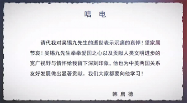 欧美同学会原会长、九三学社原中央主席,中国科协原副主席,北京大学原常务副校长,第九届全国政协常务委员韩启德先生发来唁电。中国国务院原参事石定寰等出席追思会并发言。吴老亲属并在追思会上,宣布在加州大学伯克利分校工程学院设立“吴锡九奖学金”。
