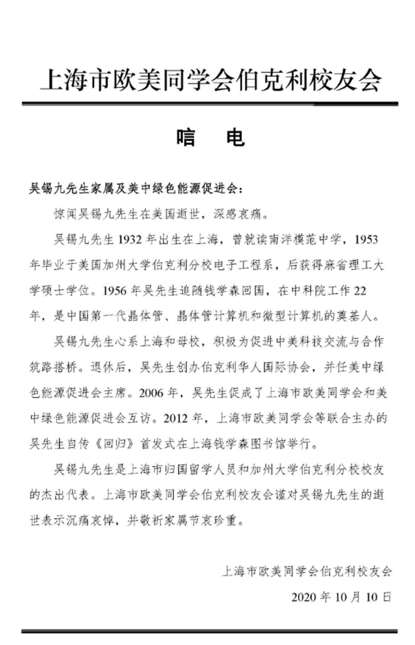 上海市欧美同学会伯克利校友会对吴锡九先生的逝世表示沉痛哀悼,并撰发唁电一封,深切缅怀吴锡九先生。校友会张喆人、谭炳麟、肖泽萍、耿靖、郑学信、马慧民、陈敏生、赵京音、瞿介明、柏国强、潘政、张剑波、宣晓华、汪鸣泉、朱蕾等理事和学长,以不同方式表达了对吴锡九先生的追思,并祈家属节哀珍重。